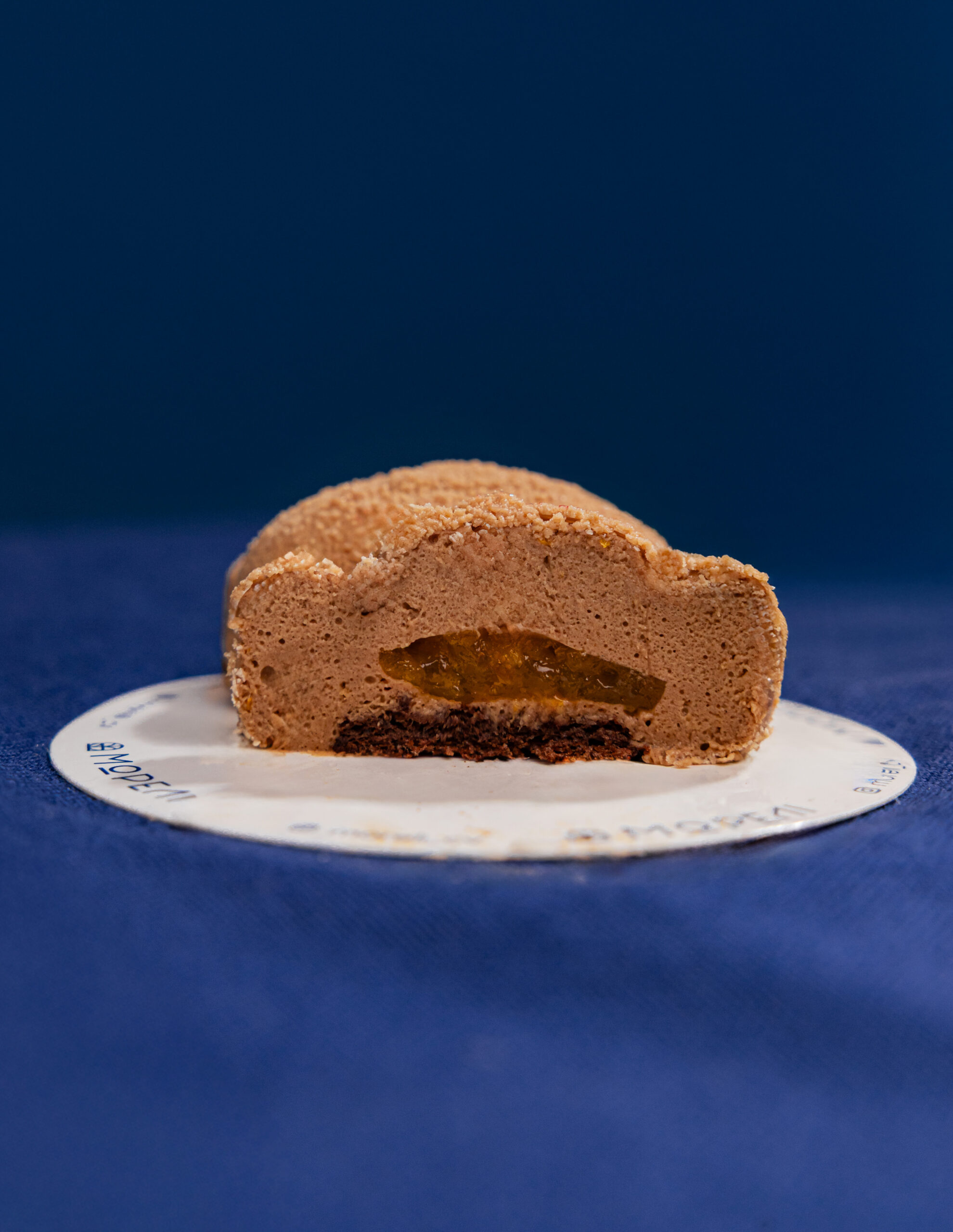 Бісквіт брауні, насичене компоте манго-апельсин і шоколадно-цитрусовий крем-чіз створюють десерт із гармонійним поєднанням глибокого шоколадного смаку, екзотичної фруктової свіжості та легкої цитрусової кислинки
